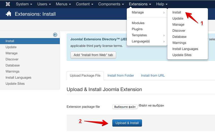 - Log into your Joomla administration console and go to "Extensions" → "Manag" → "Install".