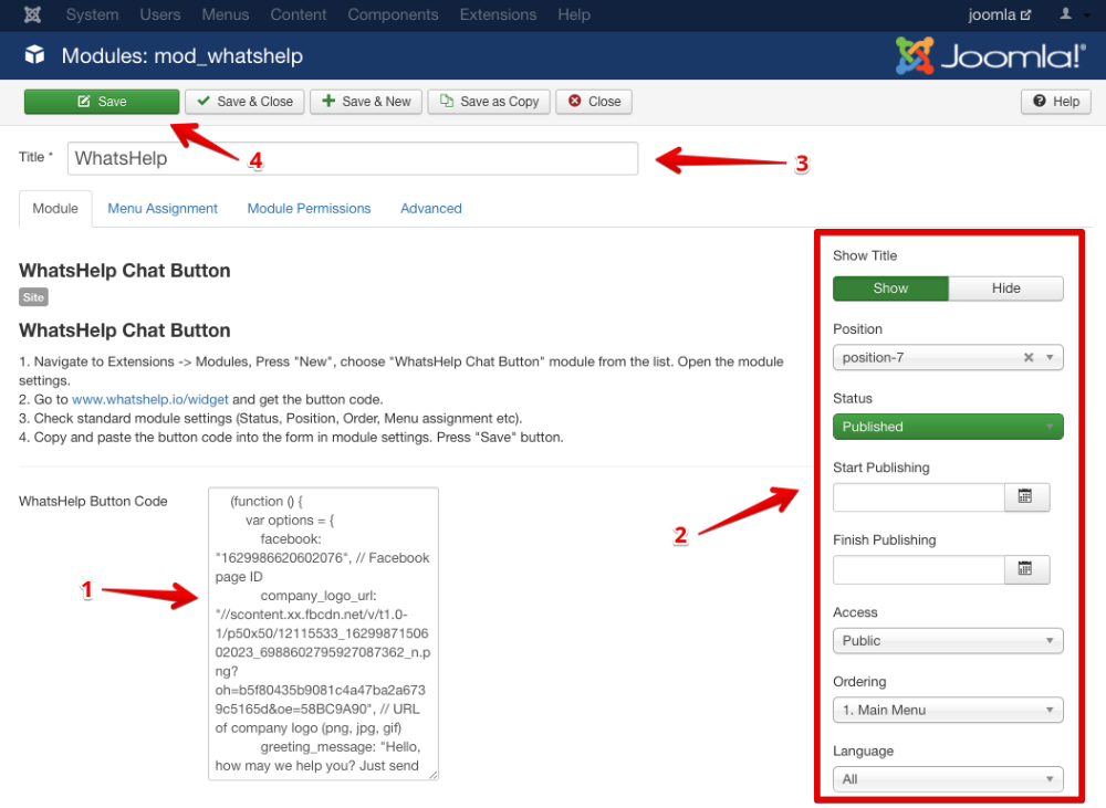 - Enter the module name and check all standard plugin settings on the top right (Status, Position, Order, Menu assignment etc).